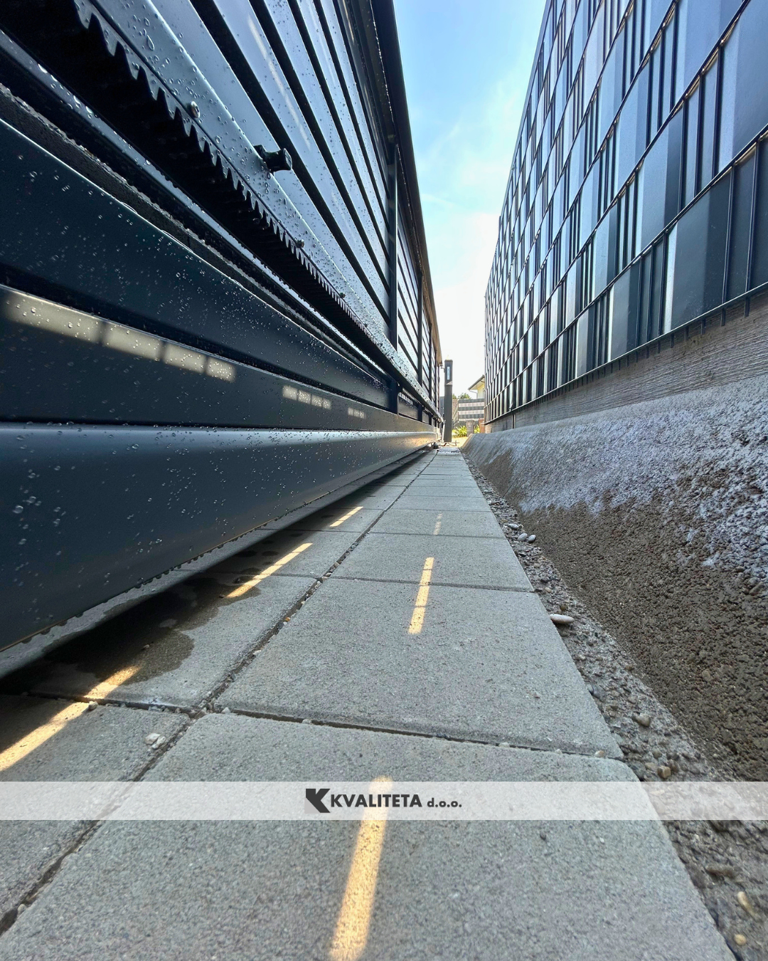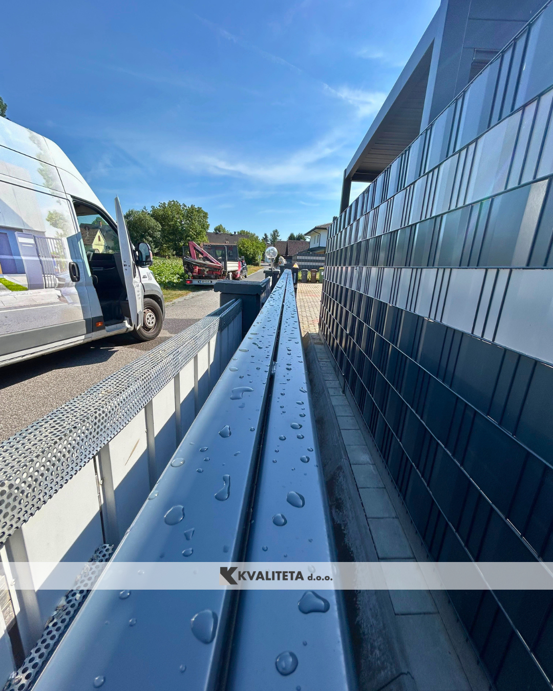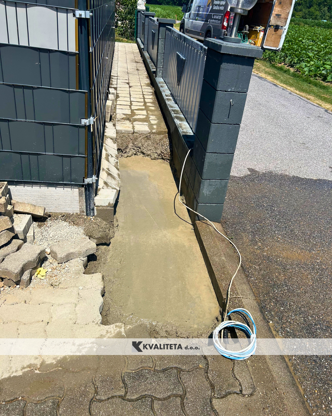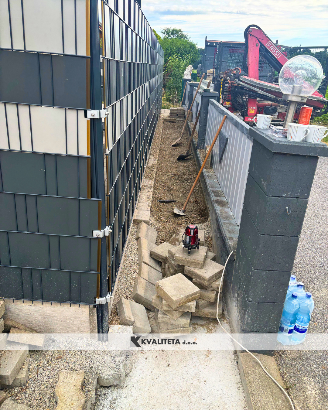 Po pripravi smo namestili ograjne elemente in stebre. Izbrani so bili moderni paneli v barvi RAL 7016 (antracit), ki lepo dopolnjujejo okolico in so odporni na vremenske vplive.
