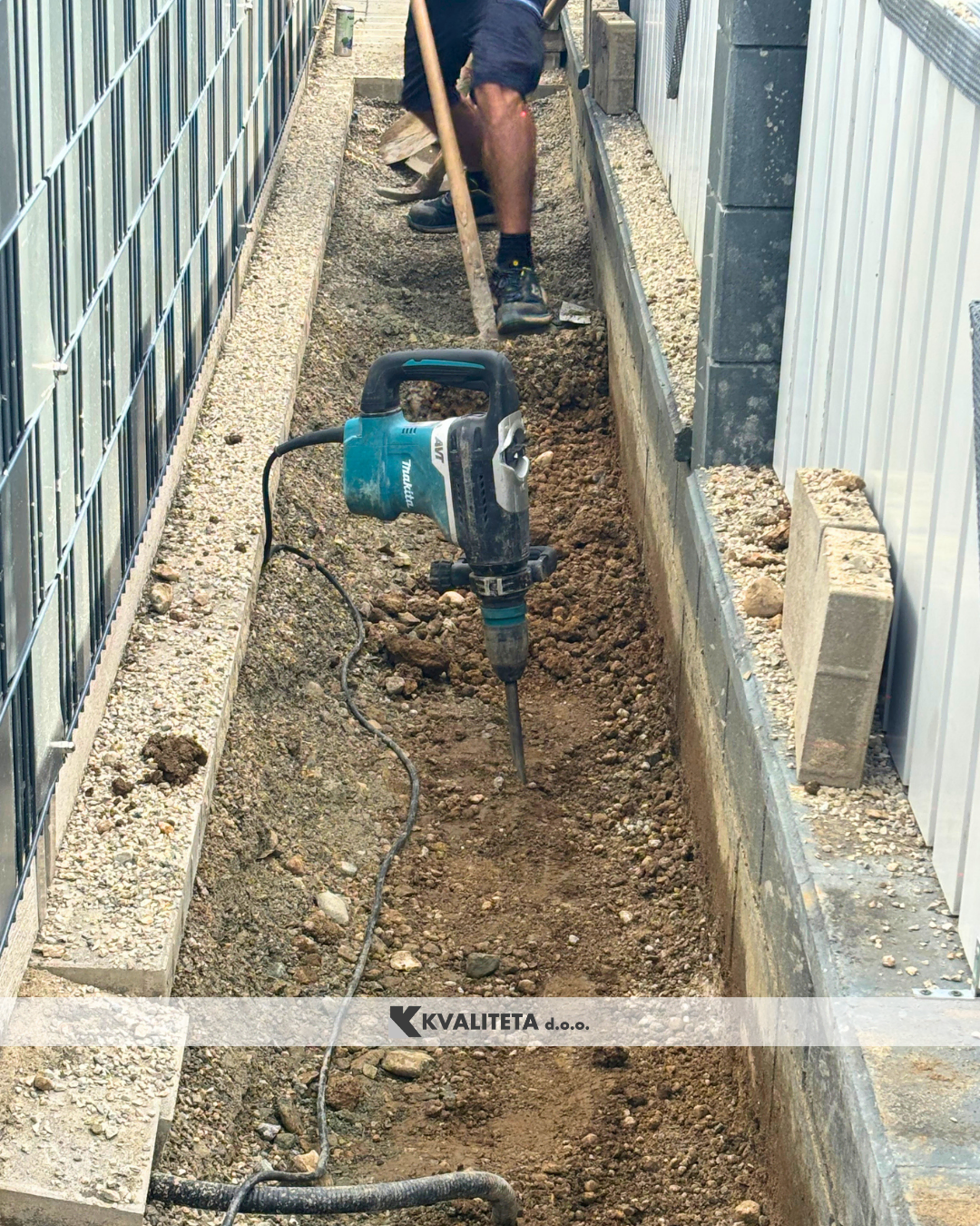 Najprej smo opravili meritve in pripravili teren za montažo. Naredili smo izkop za temelj in pripravili vse potrebno za nadaljnje delo, vključno z instalacijo za elektriko.